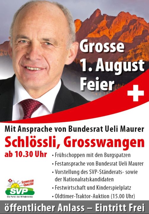 Grosswangen ist in diesem Jahr Gastgeber für die grosse 1. August-Feier der SVP des Kantons Luzern. Nebst den Ständerats- und Nationalratskandidaten der bevorstehenden Wahlen im Herbst beehrt auch Bundesrat Ueli Maurer die Gemeinde im Luzerner Hinterland. Das idyllische Schlössli in Grosswangen bietet den idealen Schauplatz, um den Schweizer Nationalfeiertag gebührend zu feiern. Ein interessantes Rahmenprogramm erwartet die Luzerner, welche sich diesen Tag nicht entgehen lassen möchten und bereits um halb 11 Uhr dem Frühschoppen beiwohnen.