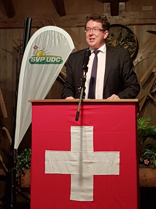 Mit viel Witz und Charme eröffnete Albert Rösti, seines Zeichens Präsident der SVP Schweiz, seine Festrede. Beeindruckt zeigte er sich vorab von der musikalischen Darbietung. Wenn er nur annähernd so gut Schwiizer-Örgeli spielen könnte, wie Fabian, René und Irene von „Die Gächä“, so wäre er wohl nie Politiker geworden. Und da nun die Herkunft seines Familiennamens in etwa gleichbedeutend mit steil und „gäch“ ist, sei er gewissermassen heute auch ein „Gächä“.