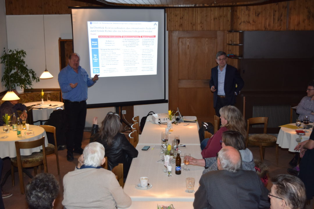 1.3 Milliarden Franken ohne Gegenleistung? Da helfe für das Verständnis nicht mal ein toller Freundschaftsvertrag mit der EU. Unruhe im Saal provozierte in Folge Nationalrat Grüter mit der neuen EU-Waffenrichtlinie. Dabei wollte Grüter gar nicht ins Detail, sondern lediglich mit dem Beispiel aufzeigen, was es heisst, automatisches EU Recht zu übernehmen. Schengen-Dublin brachte den Gasthof Löwen zum knurren und brüllen. Die einstige Abstimmung, welche vor allem wegen den Aussengrenzen auch von der SVP unterstützt wurde, ist tot. Trotzdem zieht man diese Richtlinien, wenn sie den gerade für die EU passen hinzu, ärgert sich Grüter. Die Diskussion drohte unter den Zuhörern zu eskalieren. Einig waren sie sich aber alle. Das Schengen-Dublin Abkommen sei zu kündigen. Es funktioniere nicht, Richtlinien werden nicht umgesetzt und die Flüchtlinge stehen trotzdem vor der Schweizer Grenze. «Kauft doch bei Putin ein, dann haben wir mehr Frieden in unserem Land» war nur eine von vielen Aussagen.