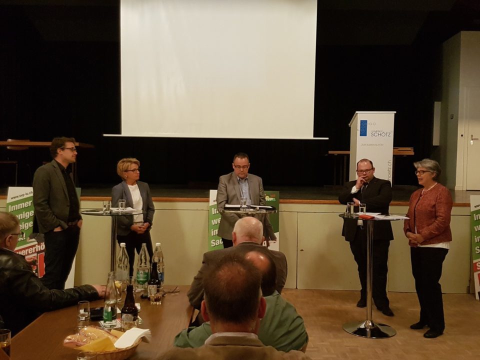 An einer Podiumsdiskussion in Schötz konnten interessierte Zuhörerinnen und Zuhörer mitverfolgen, wie sich Befürworter und Gegner in einem angeregten aber fairen Streitgespräch gegenseitig überzeugen versuchten. Die Gegner von einer erneuten Steuererhöhung, SVP Kantonsräte Angela Lüthold und Armin Hartmann standen der Kantonsrätin der CVP Inge Lichtsteiner und SP Kantonsrat David Roth gegenüber. Moderiert wurde das Podiumsgespräch von Stefan Calivers, Chefredaktor Willisauer Bote.