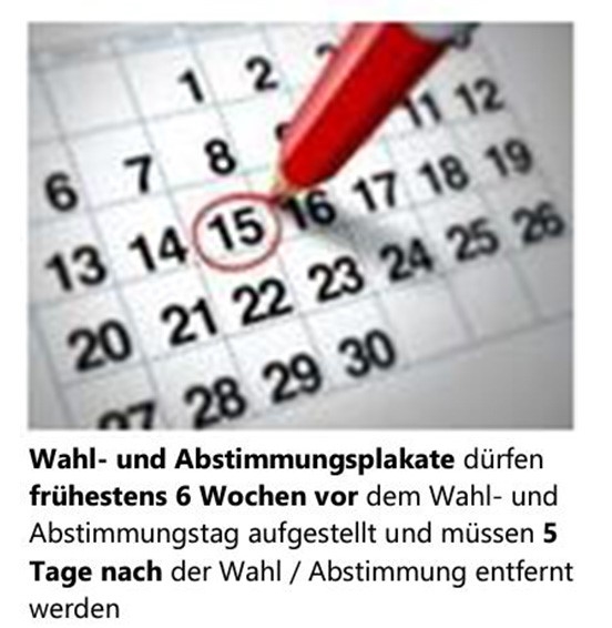 Gemäss § 6 lit. e der Reklameverordnung (RV) dürfen Reklamen für Wahlen und Abstimmungen von höchstens 3,5 m2 während 6 Wochen vor und 5 Tage nach dem Wahl- oder Abstimmungstag aufgestellt werden.