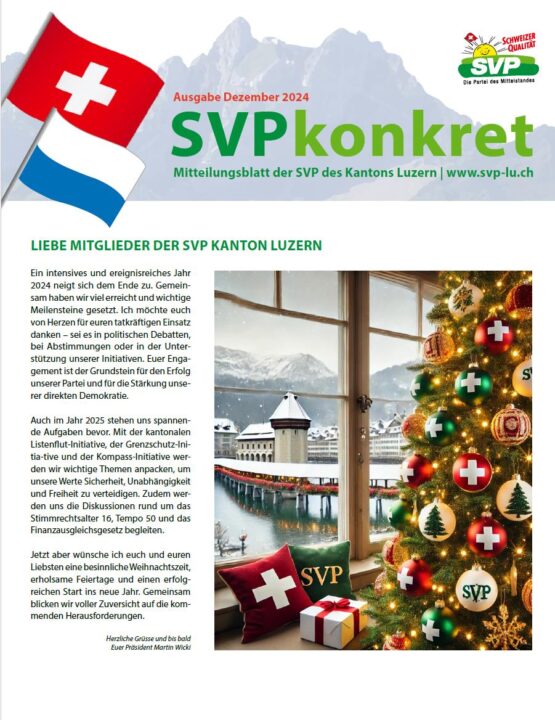 In der diesjährigen Dezemberausgabe der SVP News schauen wir mit einem besonders persönlichen Vorwort von unserer Präsidentin Angela Leuthold-Sidler zurück auf dieses sehr bewegte Jahr 2022. Wir vertiefen noch einmal unsere SRG-Initiative und informieren sie des Weiteren mit einem spannenden Beitrag über die Steuergesetzrevision 2025 aus Sicht von Armin Hartmann. Ebenfalls sind wir weihnachtlich unterwegs und berichten über den traditionellen Chlausmärt Sursee.