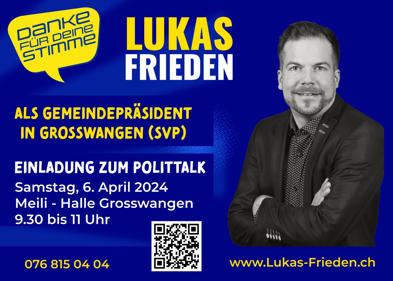 Für die vier Gemeinderatssitze treten alle Bisherigen wieder an. Beim Gemeindepräsidium kommt es in Grosswangen hingegen zu einer Kampfwahl. Nachdem im letzten Jahr der amtierenden Präsident Beat Fischer den Rücktritt erklärt hat, machte sich die SVP auf die Suche nach einem wählbaren Kandidaten. Ende 2023 wurden sie mit dem neu zugezogenen Bürger und SVP-Mitglied Lukas Frieden fündig. Der 42-jährige gelernte Elektromonteur und aktuelle Area Sales Manager bei Villiger Cigars in Pfeffikon, hat sich sofort aufgenommen gefühlt in der Gemeinde Grosswangen und will sich fortan politisch in seiner Wohngemeinde engagieren. Die Bürgernähe und die Gemeindeautonomie sind zwei brisante Themen, welche Lukas Frieden wichtig erscheinen.
