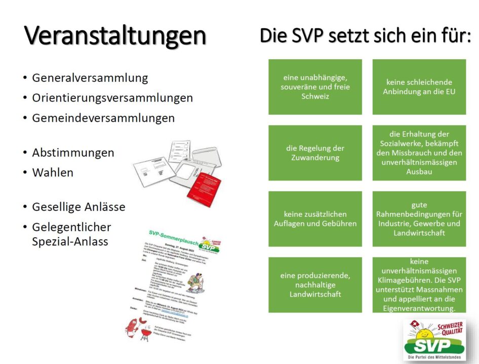 Dienstag, 06. Januar 2026 20:00 Uhr Sessionsrückblick WK Entlebuch Ort ?? Montag, 19. Januar 2026 19:30 Uhr Vorstandssitzung Ochsen Grosswangen Donnerstag, 29. Januar 2026 19:30 Uhr Kant. Delegiertenversammlung Rothenburg Freitag, 27. Februar 2026 19:00 Uhr Generalversammlung Ochsen Grosswangen ?? 20:00 Uhr a.o. Gemeindevers. Revision Ortsplanung Ochsen Grosswangen Sonntag, 08. März 2026 Abstimmungssonntag Urnenbüro Grosswangen Donnerstag, 09. April 2026 19:30 Uhr Kant. Generalversammlung ?? Donnerstag, 23. April 2026 19:30 Uhr Kant. Delegiertenversammlung ?? Mittwoch, 06. Mai 2026 19:30 Uhr EU – Anlass Emmen Montag, 11. Mai 2026 19:30 Uhr Vorstandssitzung Ochsen Grosswangen Montag, 18. Mai 2026 19:30 Uhr Orientierungsversammlung Ochsen Grosswangen Dienstag, 02. Juni 2026 20:00 Uhr Gemeindeversammlung Ochsensaal Grosswangen Sonntag, 14. Juni 2026 Abstimmungssonntag Urnenbüro Grosswangen Samstag, 01. August 2026 ganzer Tag 1. August Anlass der SVP Kantonalpartei Ort folgt später Sonntag, 23. August 2026 11:00 Uhr SVP Sommerplausch Jagdhütte Wellberg Donnerstag, 27. August 2026 19:30 Uhr Kant. Delegiertenversammlung Ochsensaal Grosswangen Donnerstag, 10. September 2026 20:00 Uhr Ortsparteienpräsidentenkonferenz ?? Freitag, 11. September 2026 18:00 Uhr Sempachertag Sempach Sonntag, 27. September 2026 Abstimmungssonntag Urnenbüro Grosswangen Donnerstag, 22. Oktober 2026 19:30 Uhr Kant. Delegiertenversammlung Kriens Pilatussaal Montag, 09. November 2026 19:30 Uhr Vorstandssitzung Ochsen Grosswangen Montag, 23. November 2026 19:30 Uhr Orientierungsversammlung Ochsen Grosswangen Sonntag, 29. November 2026 Abstimmungssonntag Urnenbüro Grosswangen Mittwoch, 02. Dezember 2026 20:00 Uhr Gemeindeversammlung Ochsensaal Grosswangen Weiter Termine und Einladungen wie Sessionsrückblicke, Referate etc. folgen per WhatsApp Chat