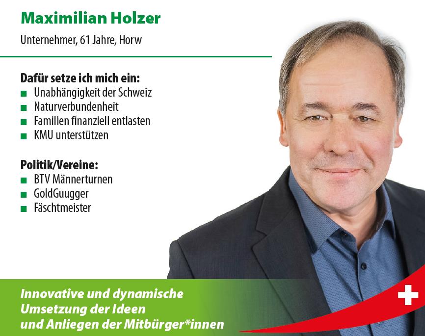 Am 5. September startet der Einwohnerrat in erneuerter Zusammensetzung in die nächste Legislatur. Die SVP-Fraktion hält weiterhin fünf Sitze. Neues Mitglied ist Maximilian Holzer, welchen wir herzlich begrüssen. Er ersetzt das bisherige Mitglied Mike Sokol, dem an dieser Stelle für seinen engagierten Einsatz im Rat vielmals gedankt wird. Die Fraktion wird sich auch in den nächsten Jahren für eine bürger- und gewerbefreundliche, verständliche und massvolle Politik in Horw einsetzen.