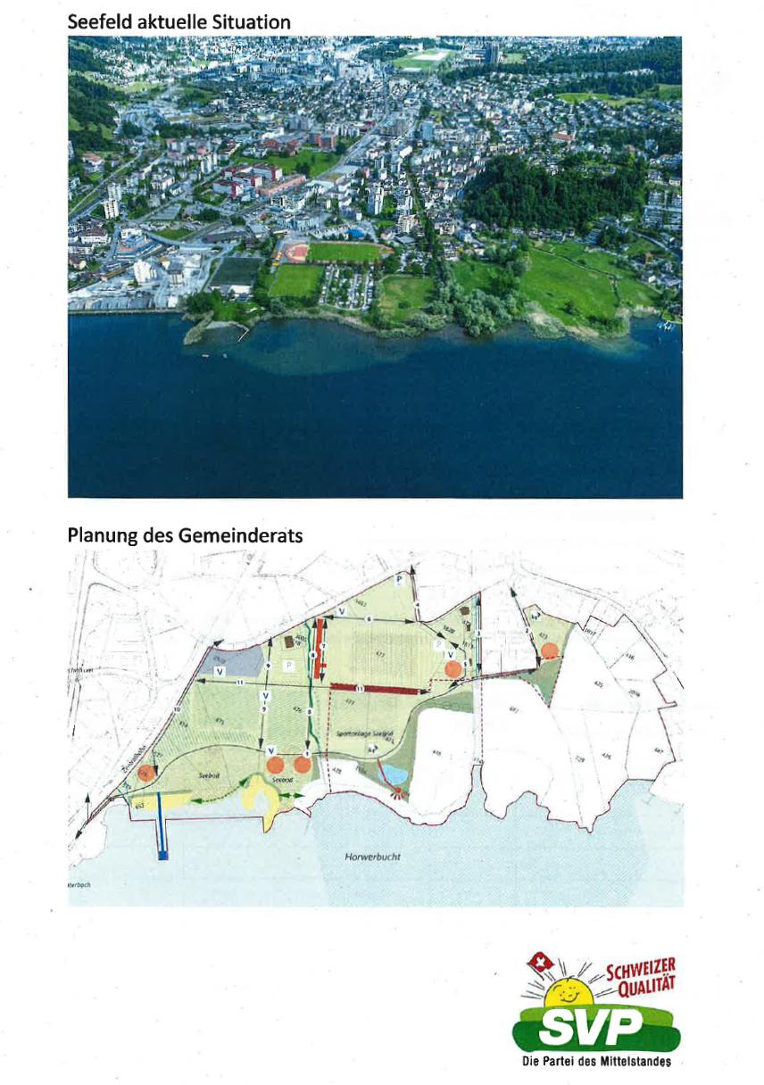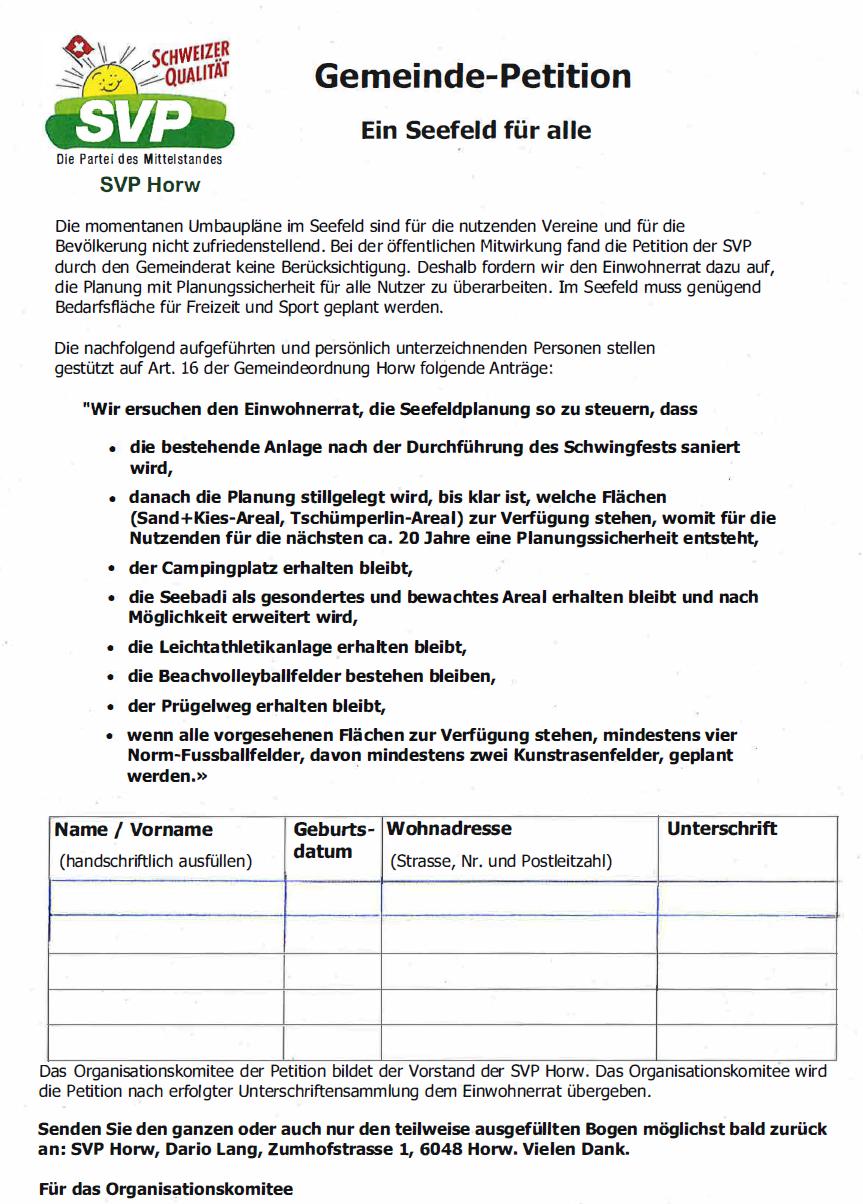 Die SVP Horw wird alles daran setzen, dass das Projekt Seefeld vernünftig und tragbar realisiert wird und der Bevölkerung den Mehrwert bietet, den sie wirklich will. Besuchen Sie uns an unserem Stand (siehe unten), verschaffen Sie sich Gehör und unterschreiben Sie bei dieser Gelegenheit unsere Petition.